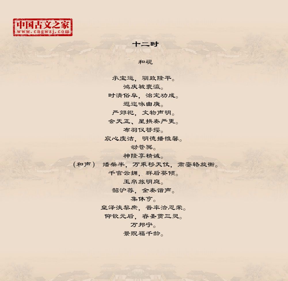 承宝运,驯致隆平。鸿庆被寰瀛。时清俗阜,治定功成。遐迩咏由庚。严郊祀,文物声明。会天正、星拱奏严更。布羽仪簪缨。宸心虔洁,明德播惟馨。动苍冥。神隆享精诚。(和声) 燔柴半,万乘移天仗,肃銮辂旋衡。千官云拥,群后葵倾。玉帛旅明庭。韶沪荐,金奏谐声。集休亨。皇泽浃黎庶,普率洽恩荣。仰钦元后,睿圣贯三灵。万邦宁。景贶福千龄。