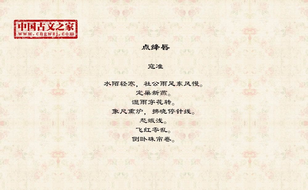 春色将阑,莺声渐老,红英落尽青梅小。画堂人静雨蒙蒙,屏山半掩余香袅。 密约沉沉...
