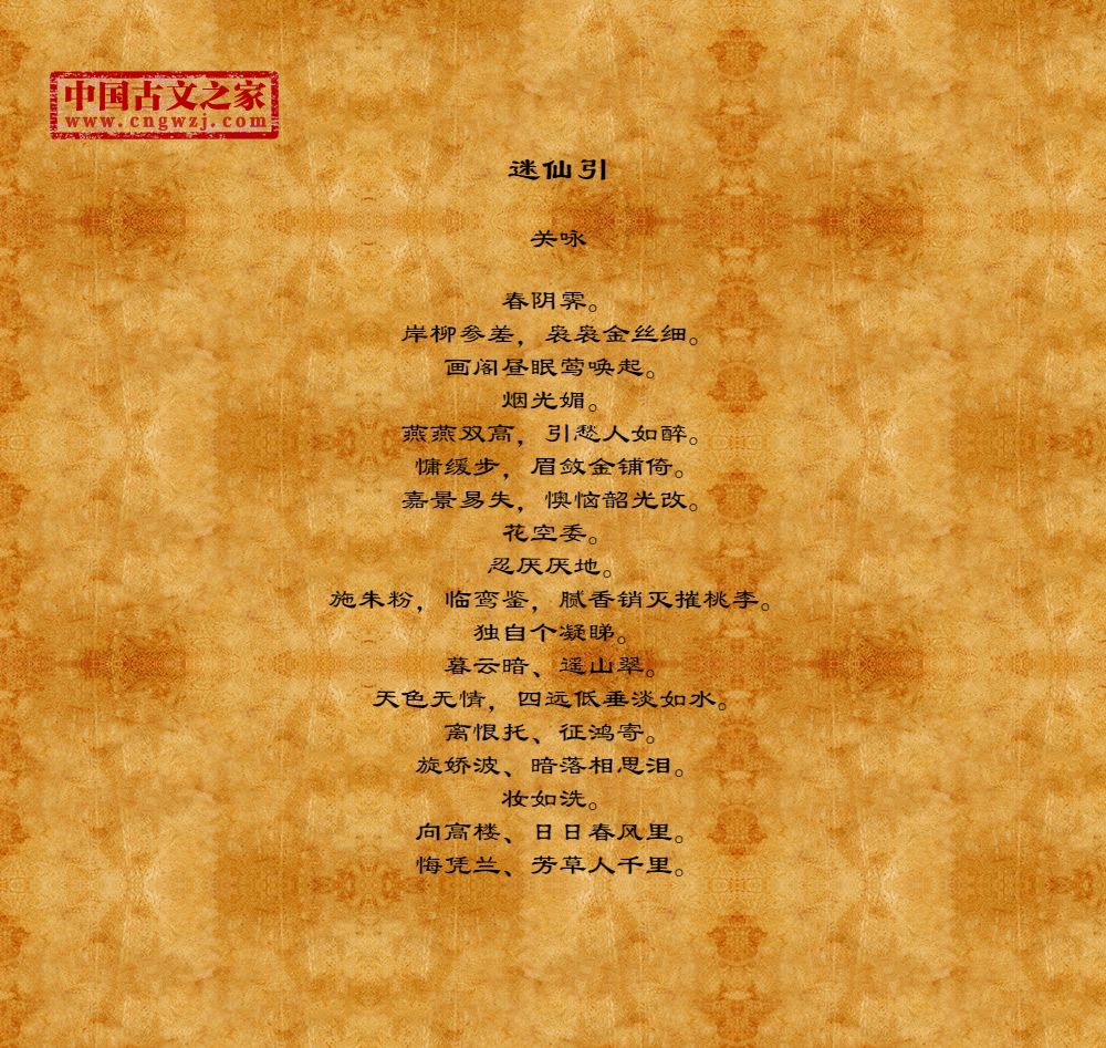 春阴霁。岸柳参差,袅袅金丝细。画阁昼眠莺唤起。烟光媚。燕燕双高,引愁人如醉。慵缓步,眉敛金铺倚。嘉景易失,懊恼韶光改。花空委。忍厌厌地。施朱粉,临鸾鉴,腻香销灭摧桃李。独自个凝睇。暮云暗、遥山翠。天色无情,四远低垂淡如水。离恨托、征鸿寄。旋娇波、暗落相思泪。妆如洗。向高楼、日日春风里。悔凭兰、芳草人千里。
