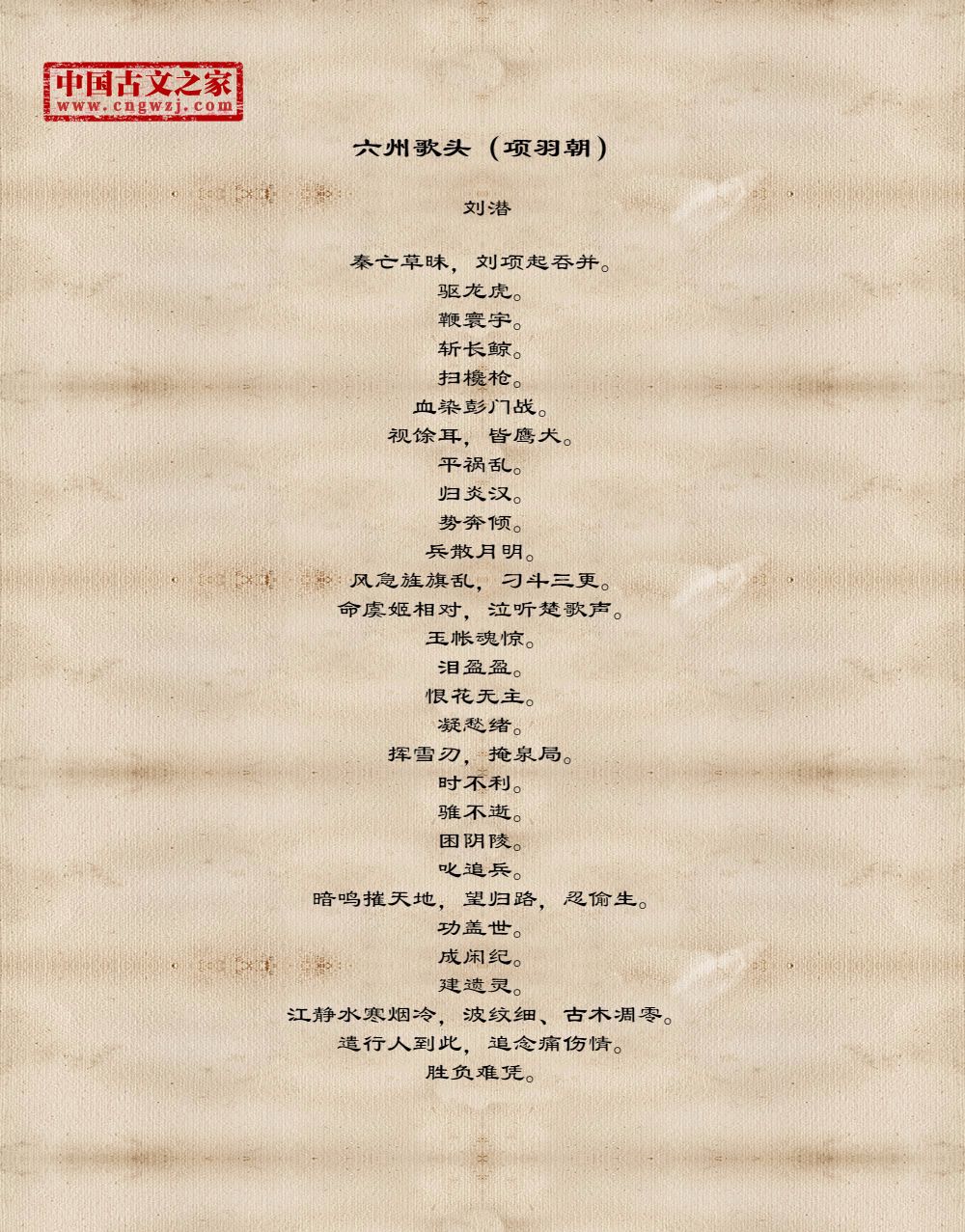 秦亡草昧,刘项起吞并。驱龙虎。鞭寰宇。斩长鲸。扫欃枪。血染彭门战。视馀耳,皆鹰犬。平祸乱。归炎汉。势奔倾。兵散月明。风急旌旗乱,刁斗三更。命虞姬相对,泣听楚歌声。玉帐魂惊。泪盈盈。恨花无主。凝愁绪。挥雪刃,掩泉局。时不利。骓不逝。困阴陵。叱追兵。暗鸣摧天地,望归路,忍偷生。功盖世。成闲纪。建遗灵。江静水寒烟冷,波纹细、古木凋零。遣行人到此,追念痛伤情。胜负难凭。
