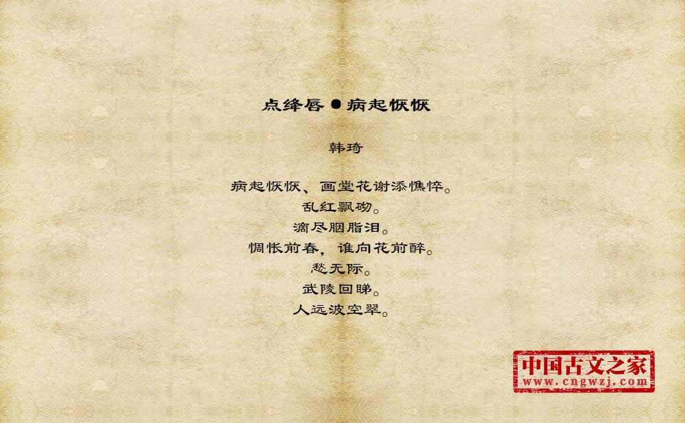⑴点绛唇:词牌名。《清真集》入“仙吕调”,元北曲同,但平仄句式略异,今京剧中犹常用之。双调四十一字,前片三仄韵,后片四仄韵。
