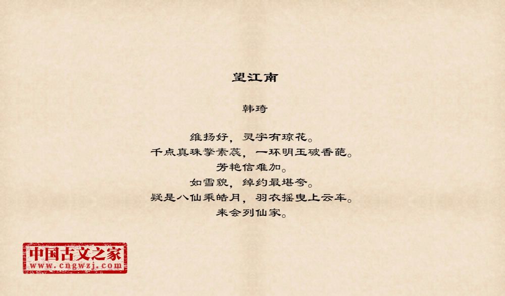 维扬好,灵宇有琼花。千点真珠擎素蕊,一环明玉破香葩。芳艳信难加。如雪貌,绰约最堪夸。疑是八仙乘皓月,羽衣摇曳上云车。来会列仙家。