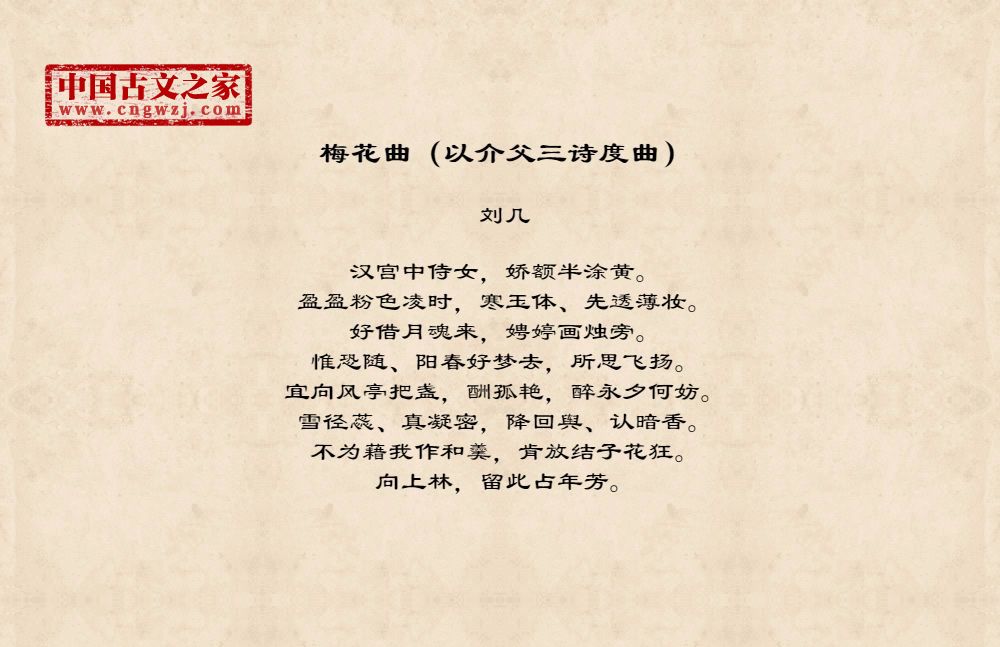 汉宫中侍女,娇额半涂黄。盈盈粉色凌时,寒玉体、先透薄妆。好借月魂来,娉婷画烛旁。惟恐随、阳春好梦去,所思飞扬。宜向风亭把盏,酬孤艳,醉永夕何妨。雪径蕊、真凝密,降回舆、认暗香。不为藉我作和羹,肯放结子花狂。向上林,留此占年芳。