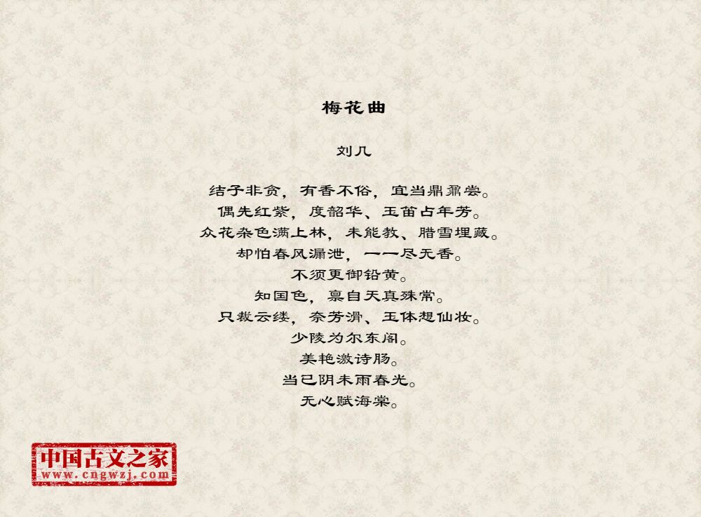 结子非贪,有香不俗,宜当鼎鼐尝。偶先红紫,度韶华、玉笛占年芳。众花杂色满上林,未能教、腊雪埋藏。却怕春风漏泄,一一尽无香。不须更御铅黄。知国色,禀自天真殊常。只裁云缕,奈芳滑、玉体想仙妆。少陵为尔东阁。美艳激诗肠。当已阴未雨春光。无心赋海棠。