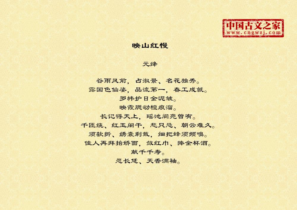 谷雨风前,占淑景、名花独秀。露国色仙姿,品流第一,春工成就。罗帏护日金泥皱。映霞腮动檀痕溜。长记得天上,瑶池阆苑曾有。千匝绕、红玉阑干,愁只恐、朝云难久。须款折、绣囊剩戴,细把蜂须频嗅。佳人再拜抬娇面,敛红巾、捧金杯酒。献千千寿。愿长恁、天香满袖。
