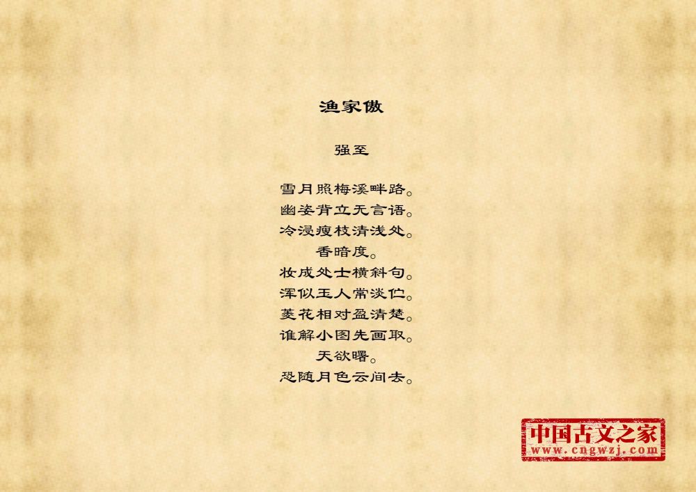 雪月照梅溪畔路。幽姿背立无言语。冷浸瘦枝清浅处。香暗度。妆成处士横斜句。浑似玉人常淡伫。菱花相对盈清楚。谁解小图先画取。天欲曙。恐随月色云间去。