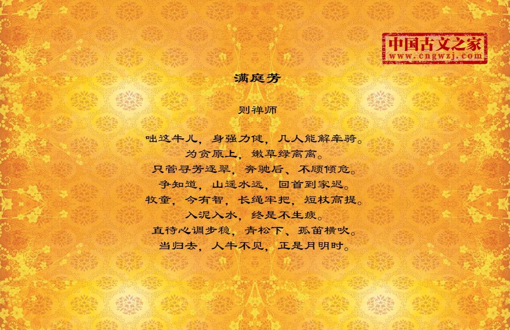 咄这牛儿,身强力健,几人能解牵骑。为贪原上,嫩草绿离离。只管寻芳逐翠,奔驰后、不顾倾危。争知道,山遥水远,回首到家迟。牧童,今有智,长绳牢把,短杖高提。入泥入水,终是不生疲。直待心调步稳,青松下、孤笛横吹。当归去,人牛不见,正是月明时。