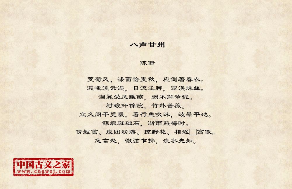 芰荷风、涤面恰麦秋,应倒著春衣。渡晓溪云湿,日流尘脚,露滉蛛丝。调翼受风雏燕,弱不解争泥。衬琅玕锦院,竹外蔷薇。立久阑干凭暖,看行鱼吹沫,波晕平池。藓痕斑础石,渐雨熟梅时。傍短篱、成团粉蝶、掠野花、相逐□高低。忘言处,徽弦乍拂,流水先知。
