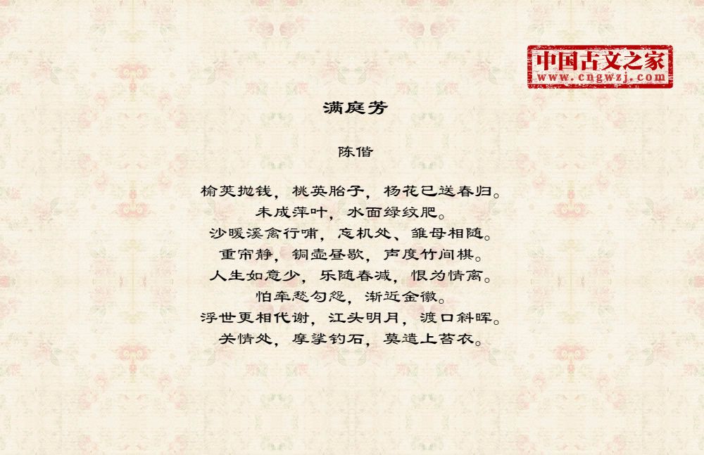 榆荚抛钱,桃英胎子,杨花已送春归。未成萍叶,水面绿纹肥。沙暖溪禽行哺,忘机处、雏母相随。重帘静,铜壶昼歇,声度竹间棋。人生如意少,乐随春减,恨为情离。怕牵愁勾怨,渐近金徽。浮世更相代谢,江头明月,渡口斜晖。关情处,摩挲钓石,莫遣上苔衣。