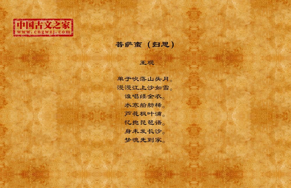 单于吹落山头月。漫漫江上沙如雪。谁唱缕金衣。水寒船舫稀。芦花枫叶浦。忆抱琵琶语。身未发长沙。梦魂先到家。