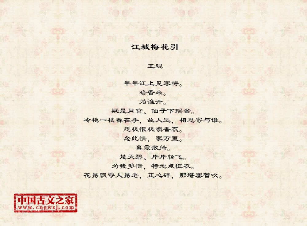 年年江上见寒梅。暗香来。为谁开。疑是月宫、仙子下瑶台。冷艳一枝春在手,故人远,相思寄与谁。怨极恨极嗅香蕊。念此情,家万里。暮霞散绮。楚天碧、片片轻飞。为我多情,特地点征衣。花易飘零人易老,正心碎,那堪塞管吹。
