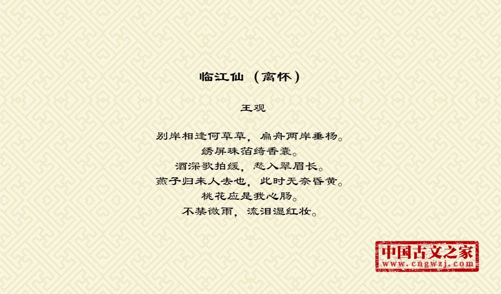 王观(1035--1100),字通叟,生于如皋(今江苏如皋),北宋著名词人。 王安石为开封府试官时,他得中科举及第。宋仁宗嘉佑二年(105