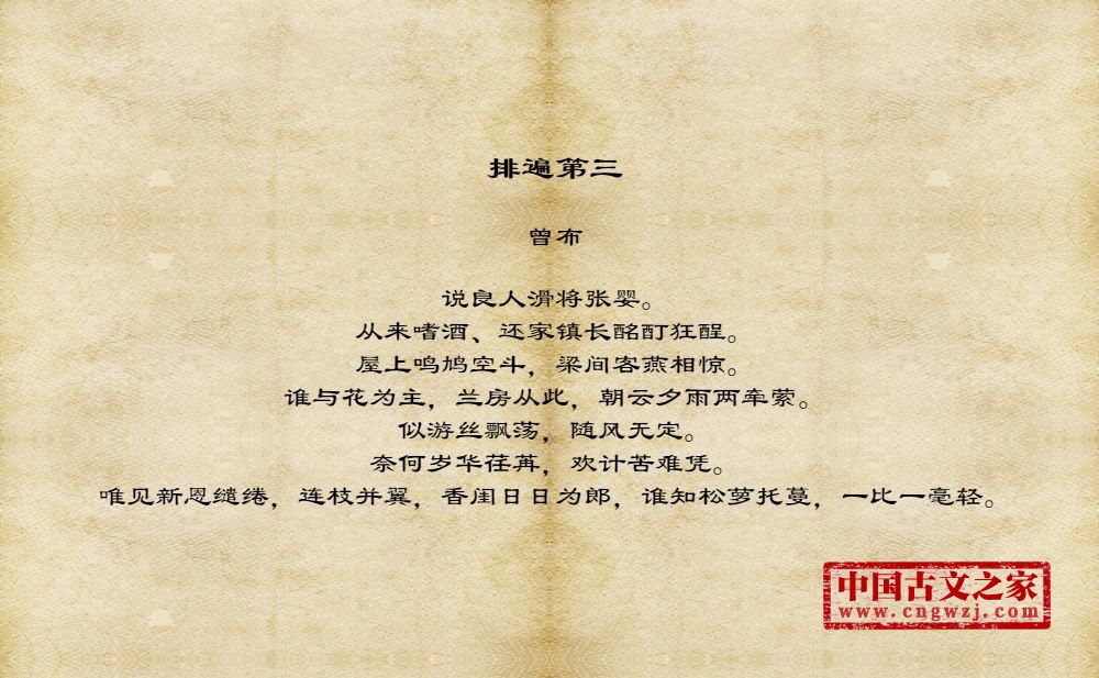 说良人滑将张婴。从来嗜酒、还家镇长酩酊狂酲。屋上鸣鸠空斗,梁间客燕相惊。谁与花为主,兰房从此,朝云夕雨两牵萦。似游丝飘荡,随风无定。奈何岁华荏苒,欢计苦难凭。唯见新恩缱绻,连枝并翼,香闺日日为郎,谁知松萝托蔓,一比一毫轻。