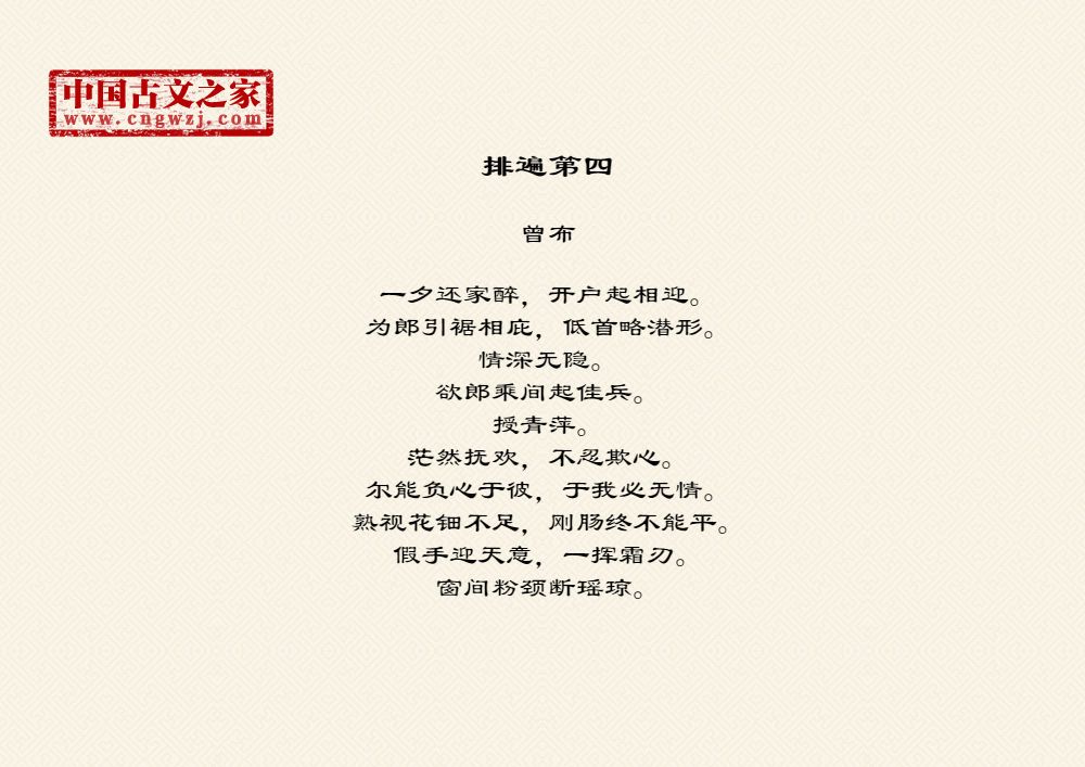 一夕还家醉,开户起相迎。为郎引裾相庇,低首略潜形。情深无隐。欲郎乘间起佳兵。授青萍。茫然抚欢,不忍欺心。尔能负心于彼,于我必无情。熟视花钿不足,刚肠终不能平。假手迎天意,一挥霜刃。窗间粉颈断瑶琼。