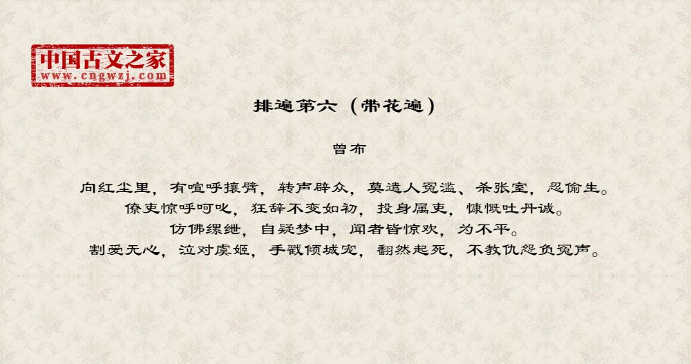 向红尘里,有喧呼攘臂,转声辟众,莫遣人冤滥、杀张室,忍偷生。僚吏惊呼呵叱,狂辞不变如初,投身属吏,慷慨吐丹诚。仿佛缧绁,自疑梦中,闻者皆惊欢,为不平。割爱无心,泣对虞姬,手戳倾城宠,翻然起死,不教仇怨负冤声。