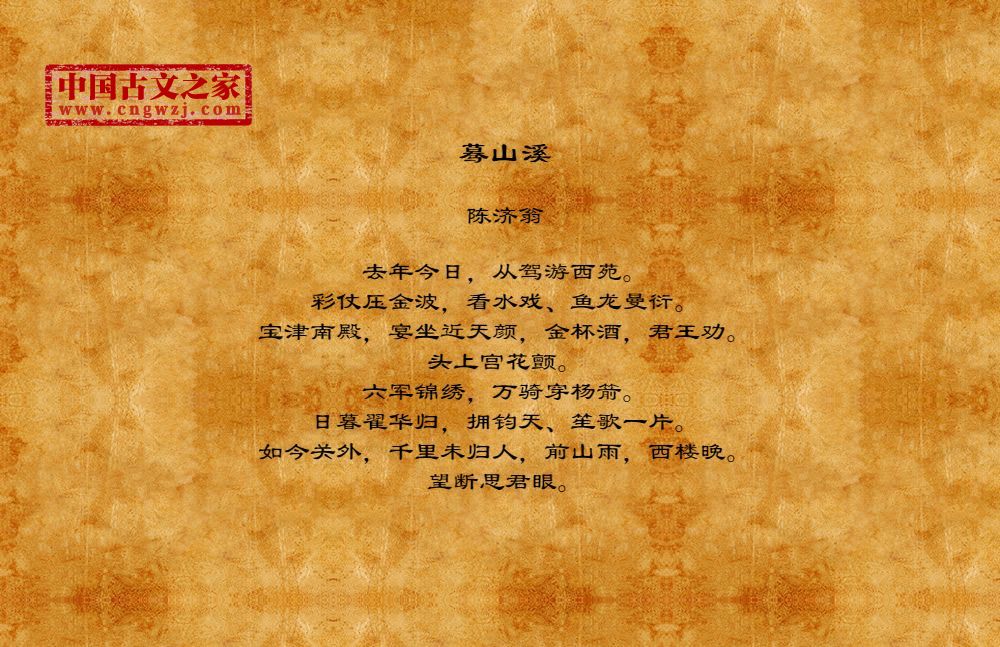 去年今日,从驾游西苑。彩仗压金波,看水戏、鱼龙曼衍。宝津南殿,宴坐近天颜,金杯酒,君王劝。头上宫花颤。六军锦绣,万骑穿杨箭。日暮翟华归,拥钧天、笙歌一片。如今关外,千里未归人,前山雨,西楼晚。望断思君眼。