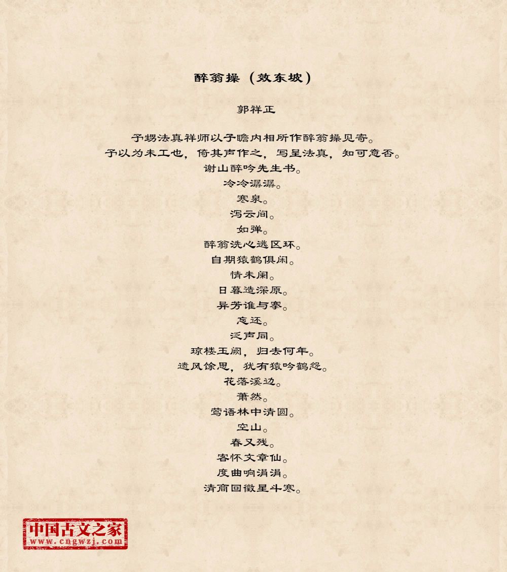 予甥法真祥师以子瞻内相所作醉翁操见寄。予以为未工也,倚其声作之,写呈法真,知可意否。谢山醉吟先生书。冷冷潺潺。寒泉。泻云间。如弹。醉翁洗心逃区环。自期猿鹤俱闲。情未阑。日暮造深原。异芳谁与搴。忘还。泛声同。琼楼玉阙,归去何年。遗风馀思,犹有猿吟鹤怨。花落溪边。萧然。莺语林中清圆。空山。春又残。客怀文章仙。度曲响涓涓。清商回徵星斗寒。