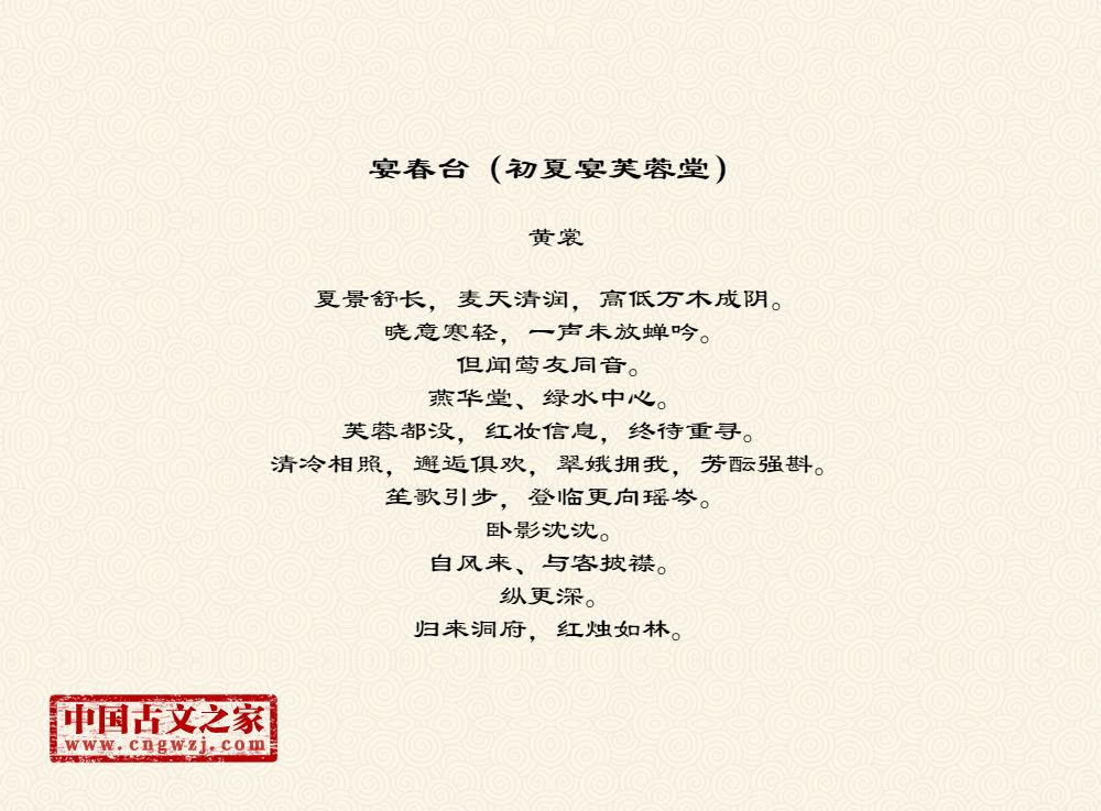 夏景舒长,麦天清润,高低万木成阴。晓意寒轻,一声未放蝉吟。但闻莺友同音。燕华堂、绿水中心。芙蓉都没,红妆信息,终待重寻。清冷相照,邂逅俱欢,翠娥拥我,芳酝强斟。笙歌引步,登临更向瑶岑。卧影沈沈。自风来、与客披襟。纵更深。归来洞府,红烛如林。