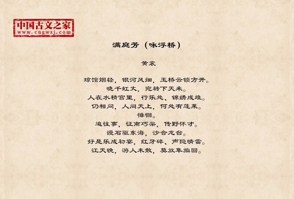 琼馆烟轻,银河风细,玉桥云锁方开。晓千虹丈,宛转下天来。人在水精宫里,行乐处、锦绣成堆。仍相问,人间天上,何处有蓬莱。徘徊。追往事,征南巧架,传野怀才。谩石驱东海,沙合龙台。好是乐成初宴,红牙碎、声隐晴雷。江天晚,游人未散,莫放隼旟回。