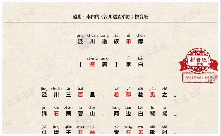 《泾川送族弟錞》拼音版,可打印PDF文档下载李白