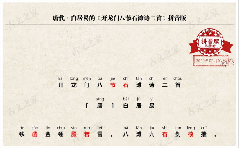 拼音全文:(我们坚持对每一篇古诗文进行人工查证并注音、我们亲自查证并回复来自您的每一次纠错,只为给您一份更为准确的拼音版本,请记住我们:古文之家)