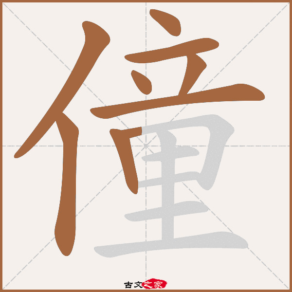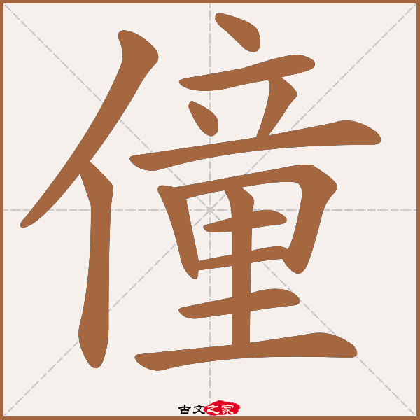 基础信息 | “僮”字,繁体为:僮,仓颉代码为:OYTG,四角号码:20215,五笔输入法:WUJF,uicode代码为:U+50EE,郑码为:NSKB,电码:-,规范字编号:5758, “僮”字,部首为:亻,总笔画:十四画,部外笔画:十二画,字形分解:亻童(rentong),汉字构造:亻立里,,汉字吉凶:-,属姓氏, 笔画顺序:ノ丨丶一丶ノ一丨フ一一丨一一, 笔画顺序读作:撇竖捺横捺撇横竖折横横竖横横, “僮”字在《康熙字典》位置:《康熙字典》第117页 第30字, 宋本广韵中描述:-, 其它字典出处:[ 古文字诂林 ]:07册,第15部,人部,2,[ 故训彙纂 ]:160|0238.4,[ 说文解字 ]:编号4925,第08卷上,人部第2字,[ 康熙字典 ]:页117第30,[ 汉语字典 ]:卷1页0221第04,[ 辞 海 ]:卷1页2660第3, |