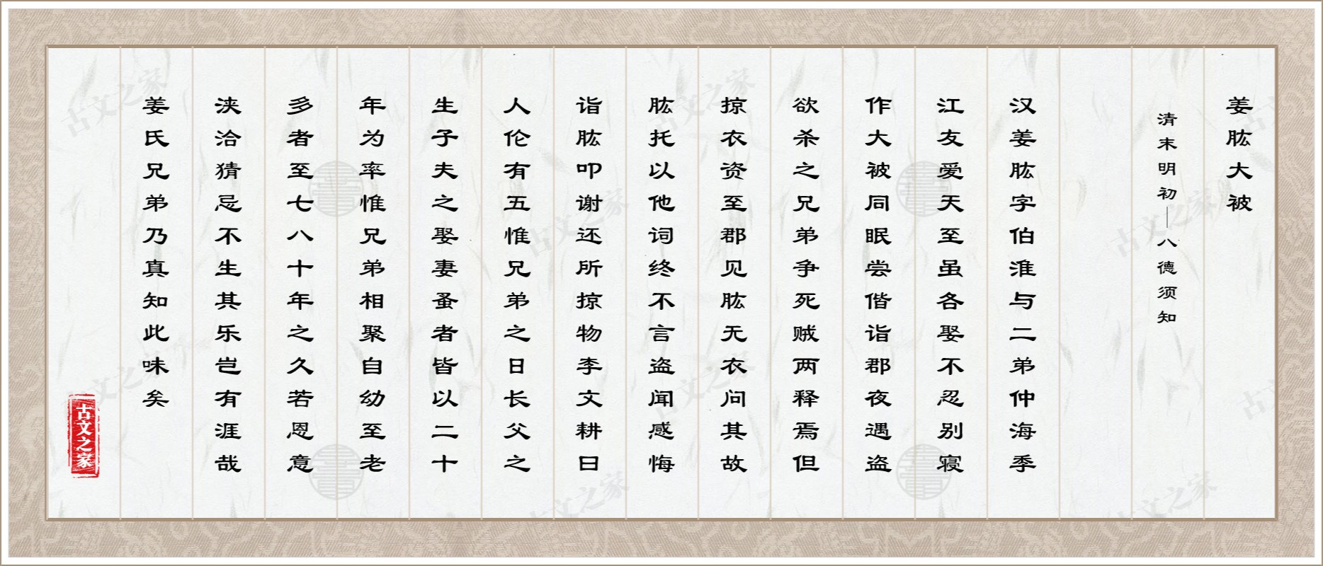 后来强盗听说了这件事,既感动又后悔,就跑来向姜肱叩头道歉,并归还了抢走的东西。