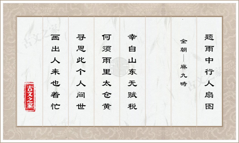幸自山东无赋税,何须雨里太仓黄。本来金山东东路、西路一带就没有赋税,何必在雨中如此匆忙。寻思此个人间世,画出人来也着忙。我想可能是这个世上太忙乱了,所以画家画里的人也这般忙碌。
