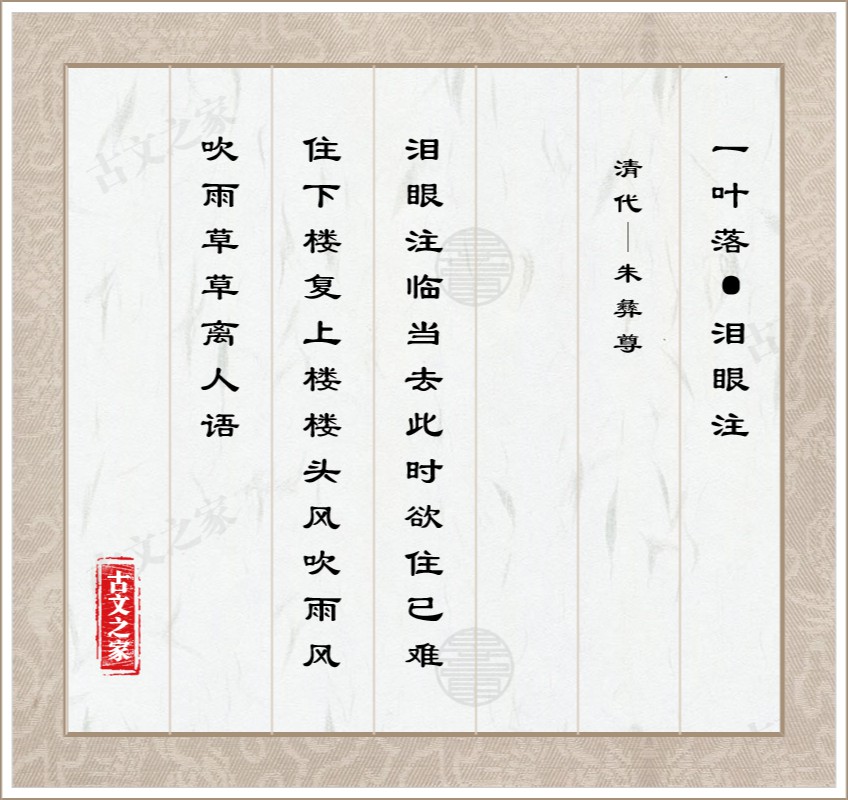 泪眼注,临当去,此时欲住已难住。下楼复上楼,楼头风吹雨。风吹雨,草草离人语。
