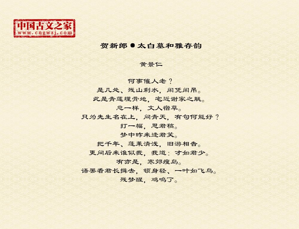 何事催人老?是几处、残山剩水,闲凭闲吊。此是青莲埋骨地,宅近谢家之脁。总一样,文人宿草。只为先生名在上,问青天,有句何能好?打一幅,思君稿。梦中昨来逢君笑。把千年、蓬莱清浅,旧游相告。更问后来谁似我,我道:才如君少。有亦是,寒郊瘦岛。语罢看君长揖去,顿身轻、一叶如飞鸟。残梦醒,鸡鸣了。