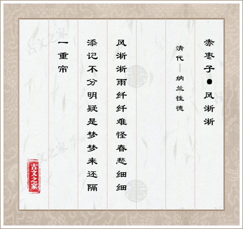 风淅淅,雨纤纤。难怪春愁细细添。记不分明疑是梦,梦来还隔一重帘。