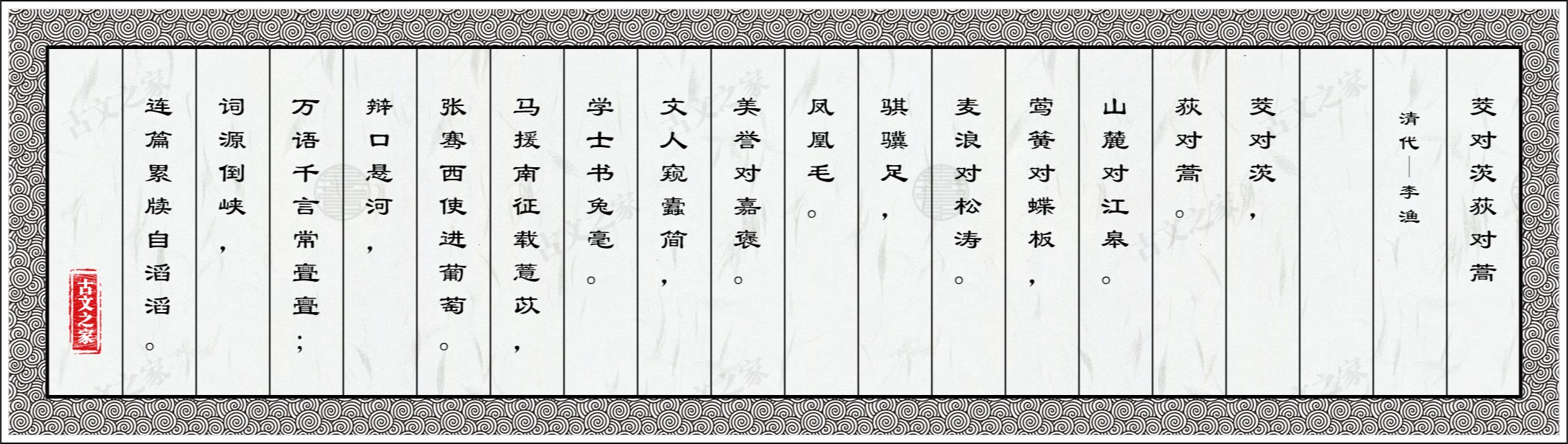 茭对茨,荻对蒿。山麓对江皋。莺簧对蝶板,麦浪对松涛。骐骥足,凤凰毛。美誉对嘉褒。文人窥蠹简,学士书兔毫。马援南征载薏苡,张骞西使进葡萄。辩口悬河,万语千言常亹亹;词源倒峡,连篇累牍自滔滔。