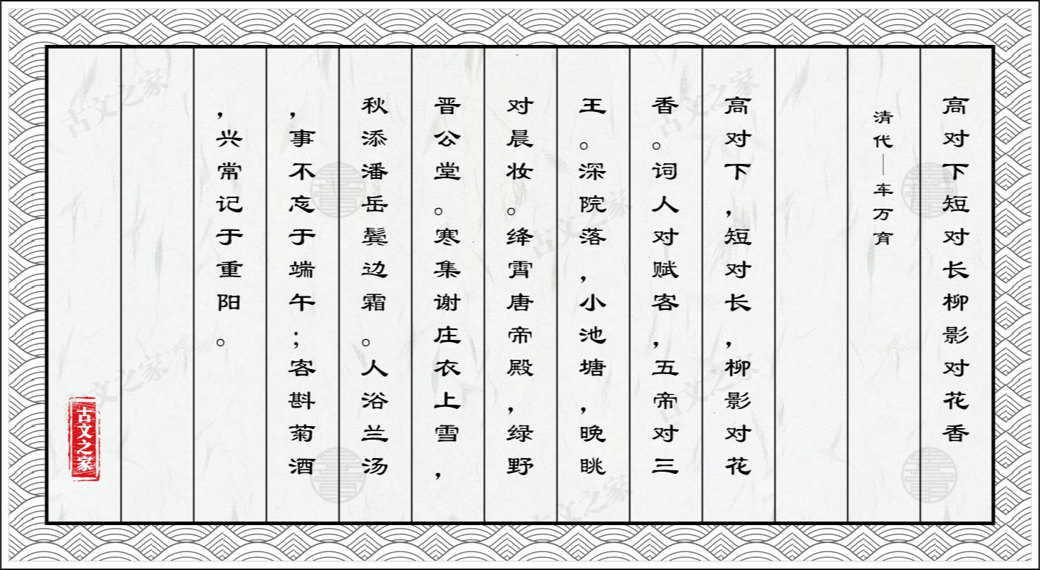 高对下,短对长,柳影对花香。词人对赋客,五帝对三王。深院落,小池塘,晚眺对晨妆。绛霄唐帝殿,绿野晋公堂。寒集谢庄衣上雪,秋添潘岳鬓边霜。人浴兰汤,事不忘于端午;客斟菊酒,兴常记于重阳。