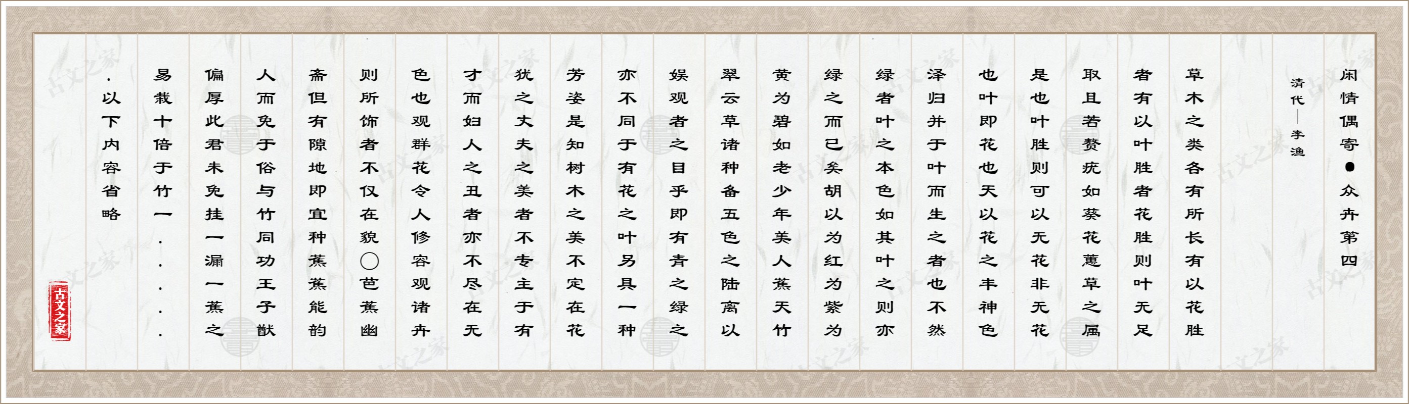 此草一名“雁来红”,一名“秋色”,一名“老少年”,皆欠妥切。雁来红者,尚有蓼花一种,经秋弄色者又不一而足,皆属泛称;惟“老少年”三字相宜,而又病其俗。予尝易其名曰“还童草”,似觉差胜。此草中仙品也,秋阶得此,群花可废。此草植之者繁,观之者众,然但知其一,未知其二,予尝细玩而得之。盖此草不特于一岁之中,经秋更媚,即一日之中,亦到晚更媚,总之后胜于前,是其性也。此意向矜独得,及阅徐竹隐诗,有“叶从秋后变,色向晚来红”一联,不知确有所见如予,知其晚来更媚平?抑下句仍同上句,其晚亦指秋乎?难起九原而问之,即谓先予一着可也。