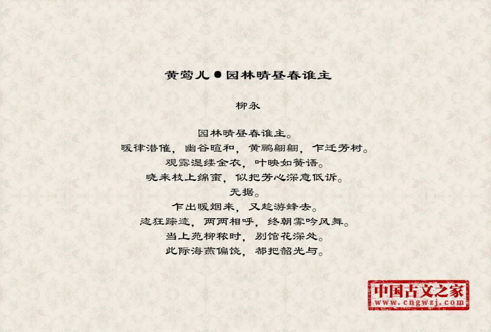 园林晴昼春谁主。暖律潜催,幽谷暄和,黄鹂翩翩,乍迁芳树。观露湿缕金衣,叶映如簧语。晓来枝上绵蛮,似把芳心深意低诉。无据。乍出暖烟来,又趁游蜂去。恣狂踪迹,两两相呼,终朝雾吟风舞。当上苑柳秾时,别馆花深处。此际海燕偏饶,都把韶光与。