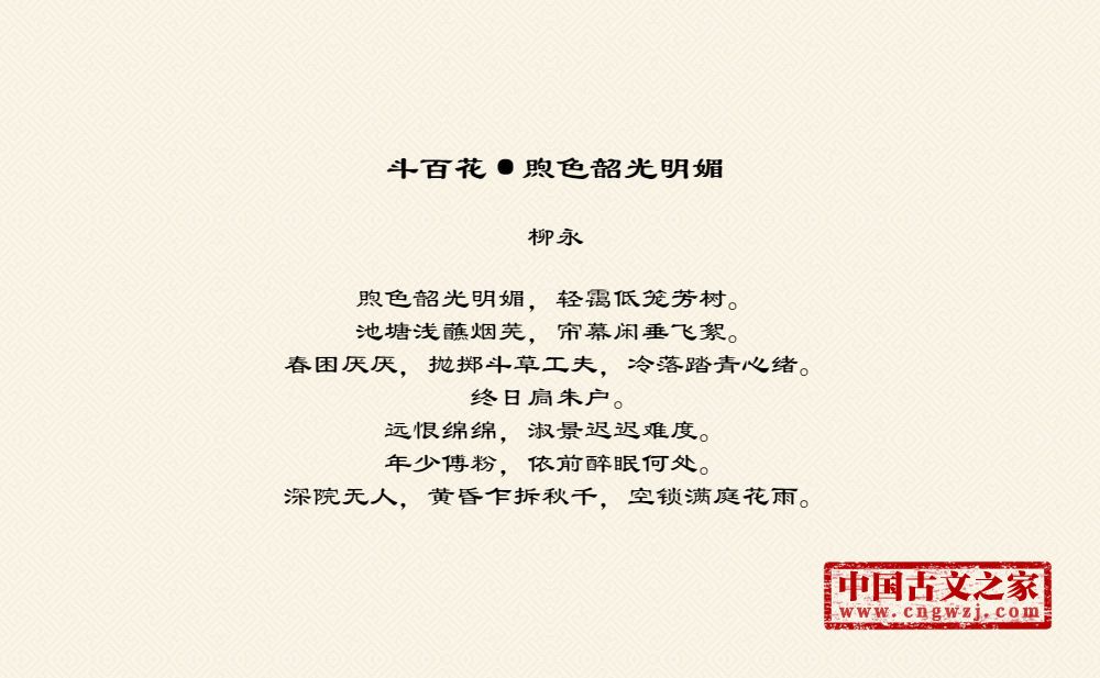 煦色韶光明媚,轻霭低笼芳树。池塘浅蘸烟芜,帘幕闲垂飞絮。春困厌厌,抛掷斗草工夫,冷落踏青心绪。终日扃朱户。远恨绵绵,淑景迟迟难度。年少傅粉,依前醉眠何处。深院无人,黄昏乍拆秋千,空锁满庭花雨。