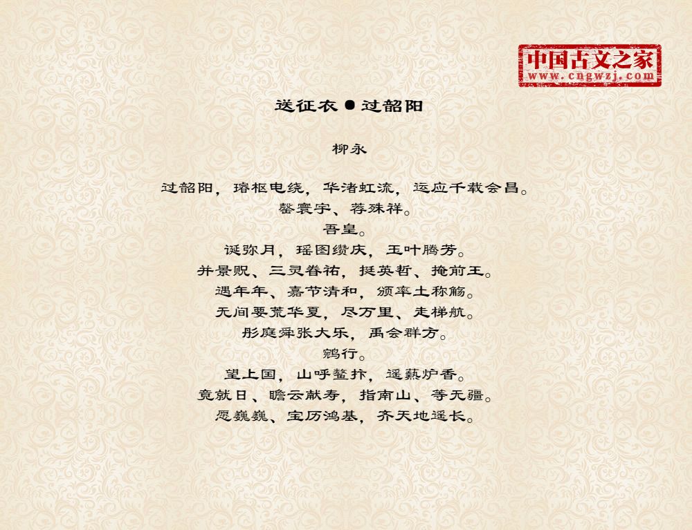 过韶阳,璿枢电绕,华渚虹流,运应千载会昌。罄寰宇、荐殊祥。吾皇。诞弥月,瑶图缵庆,玉叶腾芳。并景贶、三灵眷祐,挺英哲、掩前王。遇年年、嘉节清和,颁率土称觞。无间要荒华夏,尽万里、走梯航。彤庭舜张大乐,禹会群方。鹓行。望上国,山呼鳌抃,遥爇炉香。竟就日、瞻云献寿,指南山、等无疆。愿巍巍、宝历鸿基,齐天地遥长。