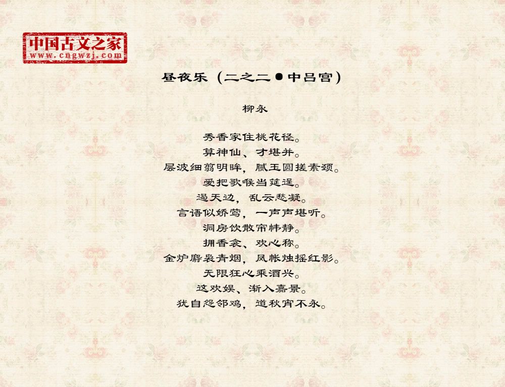 秀香家住桃花径。算神仙、才堪并。层波细翦明眸,腻玉圆搓素颈。爱把歌喉当筵逞。遏天边,乱云愁凝。言语似娇莺,一声声堪听。洞房饮散帘帏静。拥香衾、欢心称。金炉麝袅青烟,凤帐烛摇红影。无限狂心乘酒兴。这欢娱、渐入嘉景。犹自怨邻鸡,道秋宵不永。