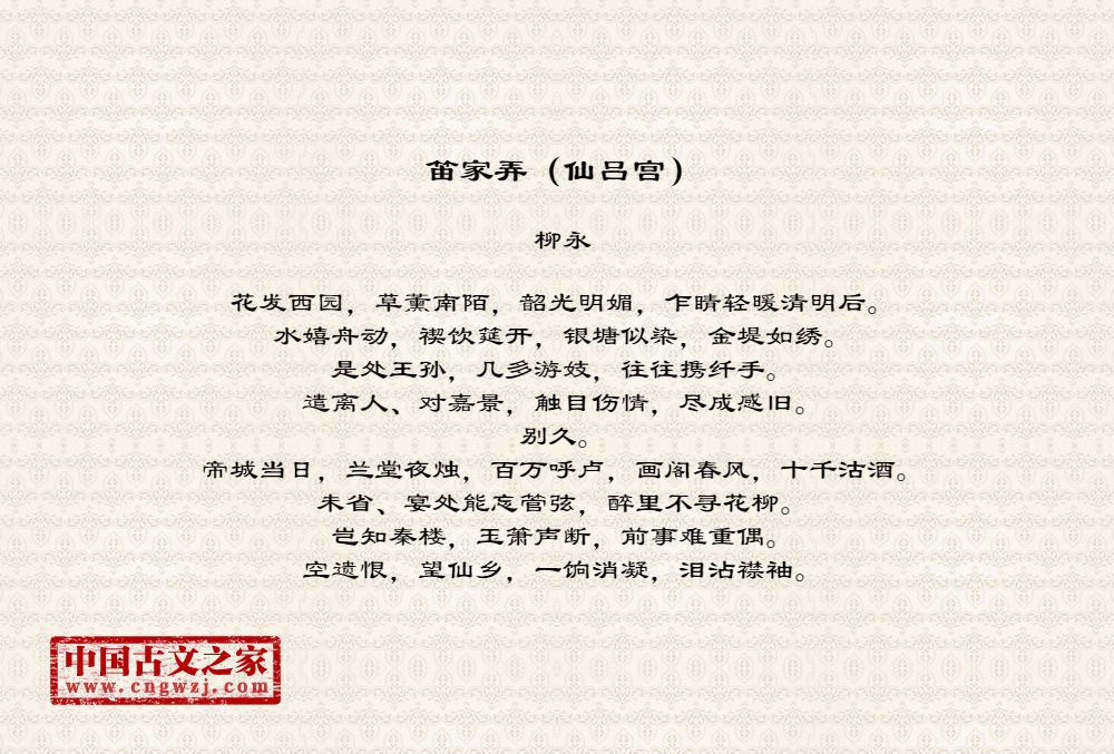花发西园,草薰南陌,韶光明媚,乍睛轻暖清明后。水嬉舟动,禊饮筵开,银塘似染,金堤如绣。是处王孙,几多游妓,往往携纤手。遣离人、对嘉景,触目伤情,尽成感旧。别久。帝城当日,兰堂夜烛,百万呼卢,画阁春风,十千沽酒。未省、宴处能忘管弦,醉里不寻花柳。岂知秦楼,玉箫声断,前事难重偶。空遗恨,望仙乡,一饷消凝,泪沾襟袖。