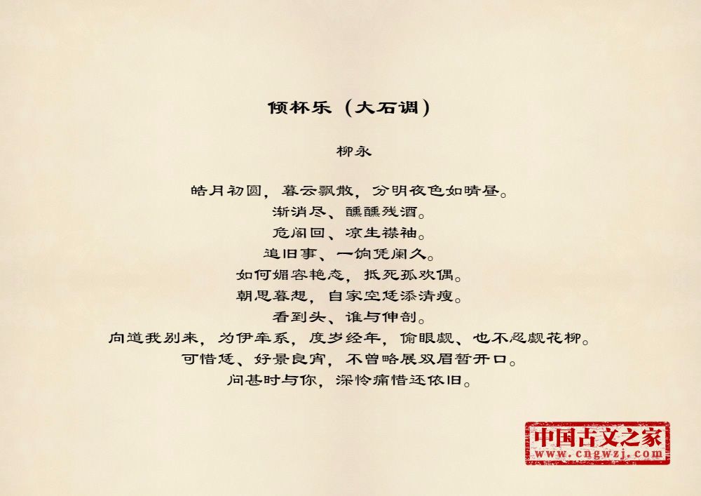 皓月初圆,暮云飘散,分明夜色如晴昼。渐消尽、醺醺残酒。危阁回、凉生襟袖。追旧事、一饷凭阑久。如何媚容艳态,抵死孤欢偶。朝思暮想,自家空恁添清瘦。看到头、谁与伸剖。向道我别来,为伊牵系,度岁经年,偷眼觑、也不忍觑花柳。可惜恁、好景良宵,不曾略展双眉暂开口。问甚时与你,深怜痛惜还依旧。