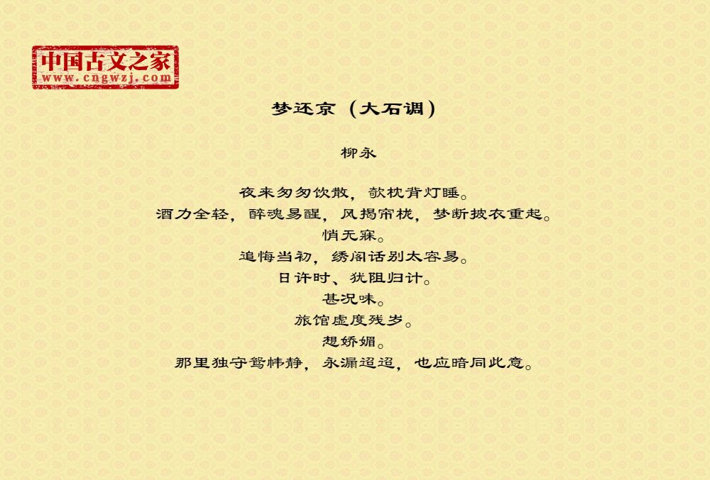 夜来匆匆饮散,欹枕背灯睡。酒力全轻,醉魂易醒,风揭帘栊,梦断披衣重起。悄无寐。追悔当初,绣阁话别太容易。日许时、犹阻归计。甚况味。旅馆虚度残岁。想娇媚。那里独守鸳帏静,永漏迢迢,也应暗同此意。