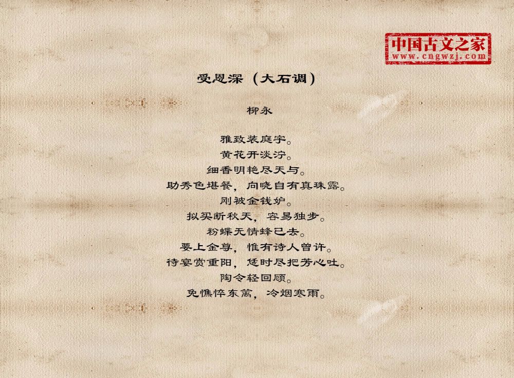 雅致装庭宇。黄花开淡泞。细香明艳尽天与。助秀色堪餐,向晓自有真珠露。刚被金钱妒。拟买断秋天,容易独步。粉蝶无情蜂已去。要上金尊,惟有诗人曾许。待宴赏重阳,恁时尽把芳心吐。陶令轻回顾。免憔悴东篱,冷烟寒雨。