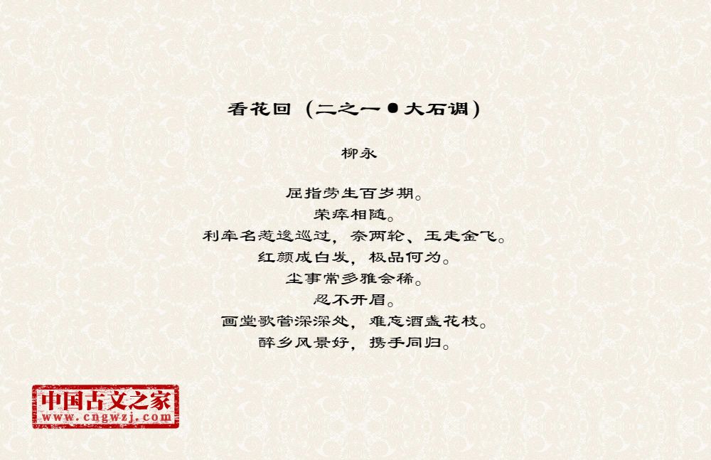 屈指劳生百岁期。荣瘁相随。利牵名惹逡巡过,奈两轮、玉走金飞。红颜成白发,极品何为。尘事常多雅会稀。忍不开眉。画堂歌管深深处,难忘酒盏花枝。醉乡风景好,携手同归。