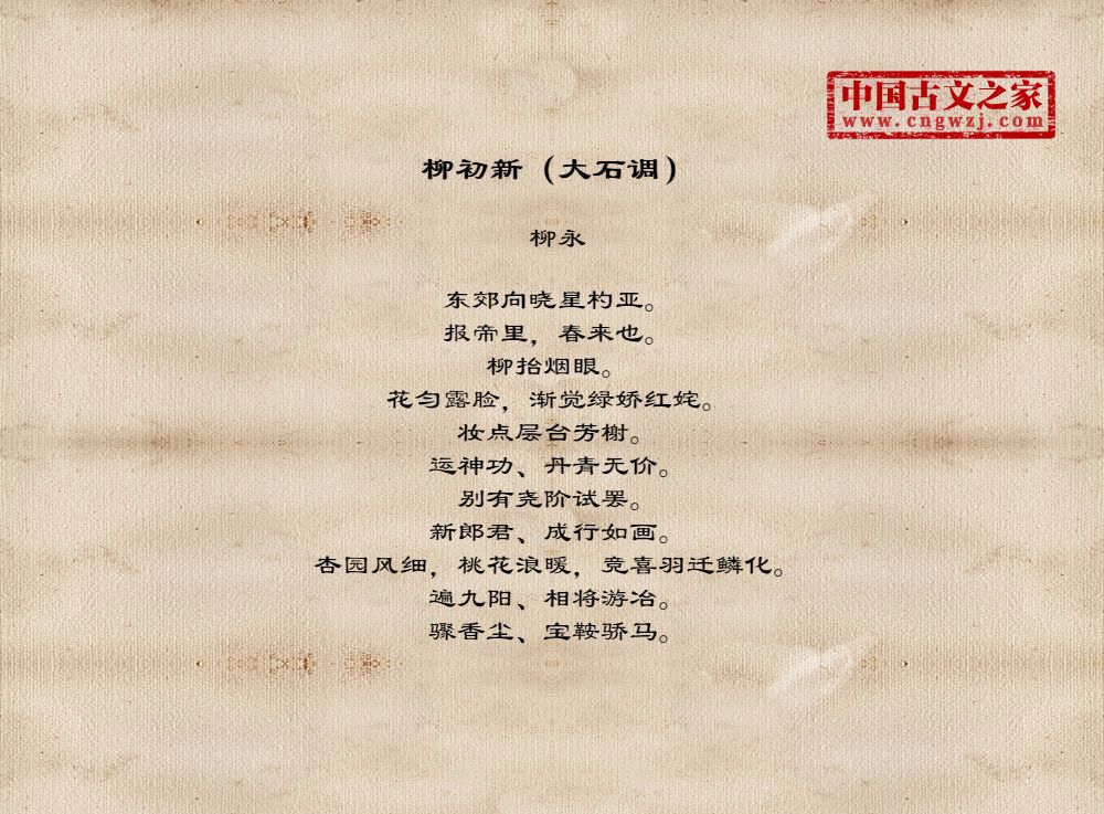 东郊向晓星杓亚。报帝里,春来也。柳抬烟眼。花匀露脸,渐觉绿娇红姹。妆点层台芳榭。运神功、丹青无价。别有尧阶试罢。新郎君、成行如画。杏园风细,桃花浪暖,竞喜羽迁鳞化。遍九阳、相将游冶。骤香尘、宝鞍骄马。