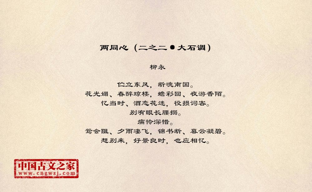 伫立东风,断魂南国。花光媚、春醉琼楼,蟾彩回、夜游香陌。忆当时、酒恋花迷,役损词客。别有眼长腰搦。痛怜深惜。鸳会阻、夕雨凄飞,锦书断、暮云凝碧。想别来,好景良时,也应相忆。