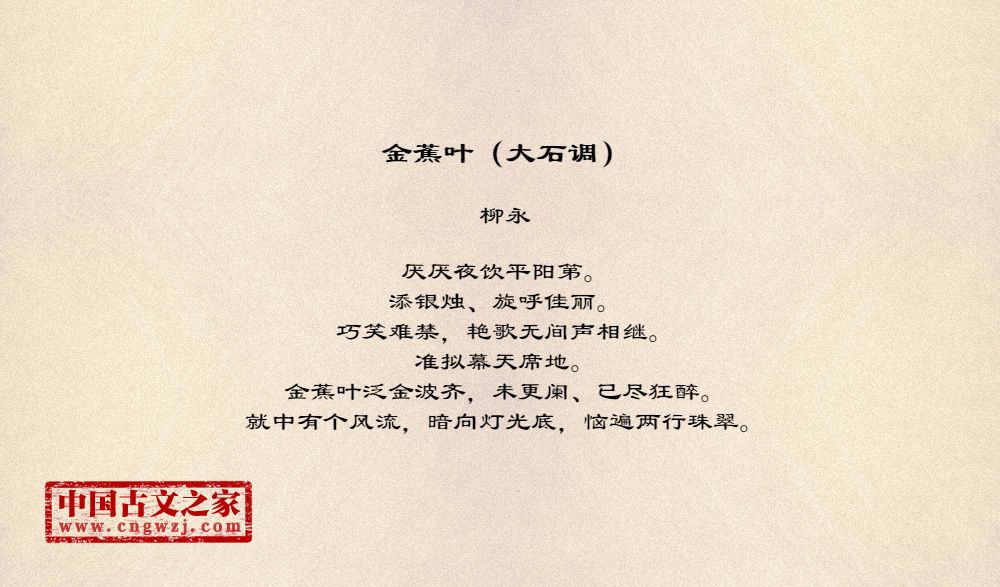 厌厌夜饮平阳第。添银烛、旋呼佳丽。巧笑难禁,艳歌无间声相继。准拟幕天席地。金蕉叶泛金波齐,未更阑、已尽狂醉。就中有个风流,暗向灯光底,恼遍两行珠翠。