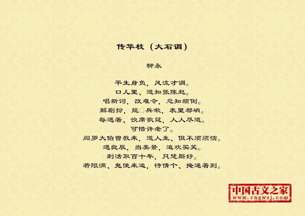 平生身负,风流才调。口儿里、道知张陈赵。唱新词,改难令,总知颠倒。解剧扮,能兵嗽,表里都峭。每遇著、饮席歌筵,人人尽道。可惜许老了。阎罗大伯曾教来,道人生、但不须烦恼。遇良辰,当美景,追欢买笑。剩活取百十年,只恁厮好。若限满、鬼使来追,待倩个、掩通著到。