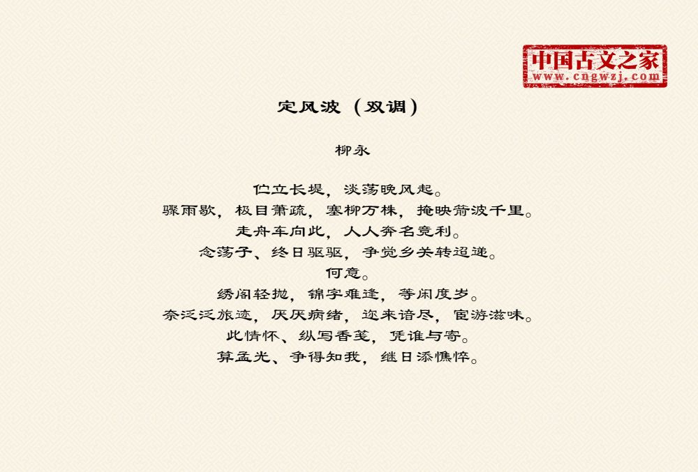 伫立长堤,淡荡晚风起。骤雨歇,极目萧疏,塞柳万株,掩映箭波千里。走舟车向此,人人奔名竞利。念荡子、终日驱驱,争觉乡关转迢递。何意。绣阁轻抛,锦字难逢,等闲度岁。奈泛泛旅迹,厌厌病绪,迩来谙尽,宦游滋味。此情怀、纵写香笺,凭谁与寄。算孟光、争得知我,继日添憔悴。