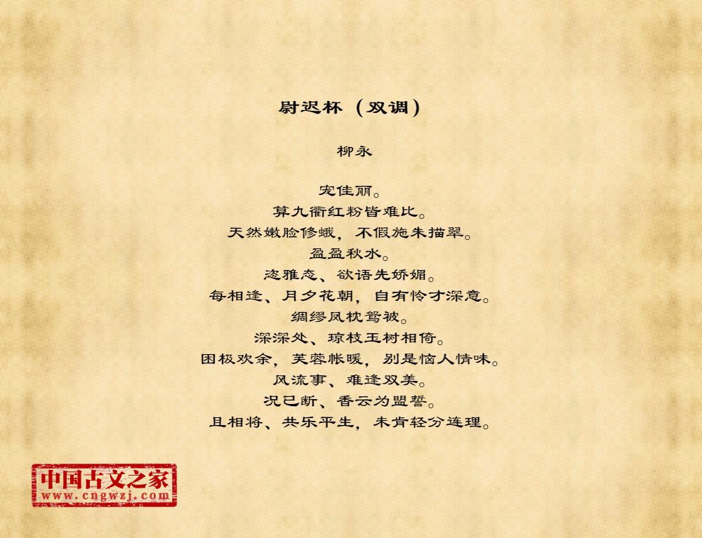 宠佳丽。算九衢红粉皆难比。天然嫩脸修蛾,不假施朱描翠。盈盈秋水。恣雅态、欲语先娇媚。每相逢、月夕花朝,自有怜才深意。绸缪凤枕鸳被。深深处、琼枝玉树相倚。困极欢余,芙蓉帐暖,别是恼人情味。风流事、难逢双美。况已断、香云为盟誓。且相将、共乐平生,未肯轻分连理。