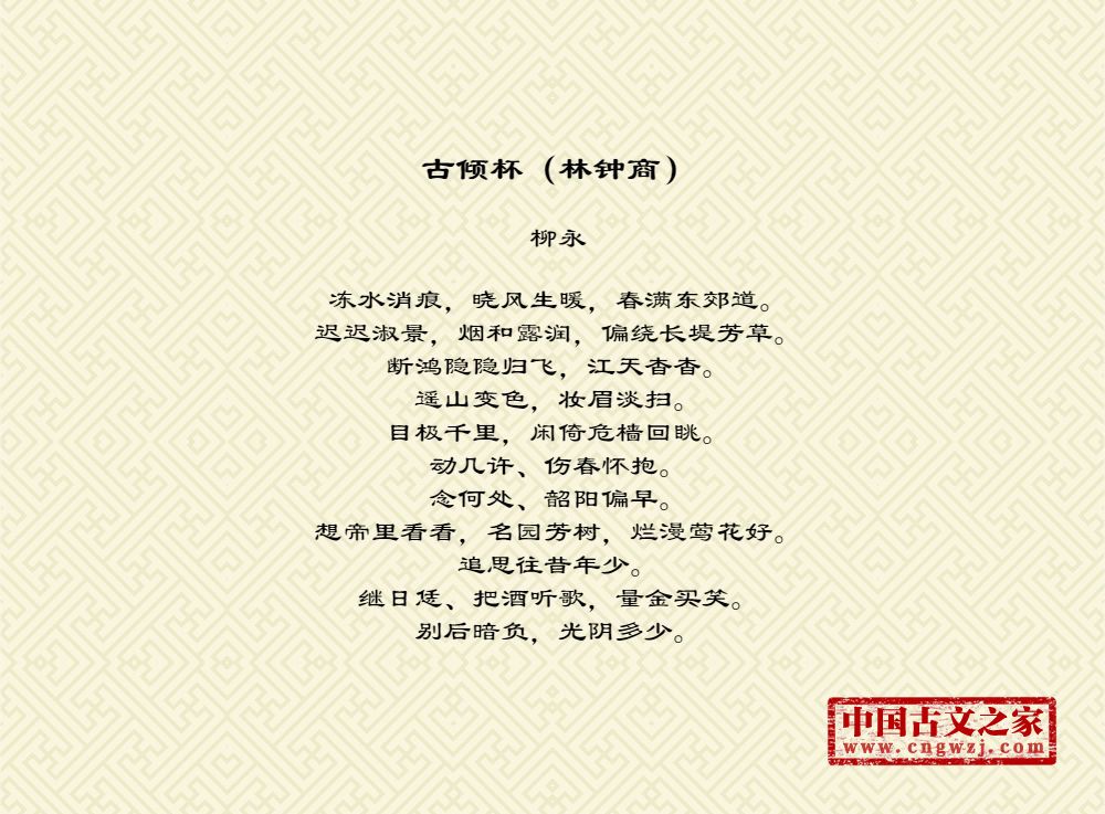 冻水消痕,晓风生暖,春满东郊道。迟迟淑景,烟和露润,偏绕长堤芳草。断鸿隐隐归飞,江天杳杳。遥山变色,妆眉淡扫。目极千里,闲倚危樯回眺。动几许、伤春怀抱。念何处、韶阳偏早。想帝里看看,名园芳树,烂漫莺花好。追思往昔年少。继日恁、把酒听歌,量金买笑。别后暗负,光阴多少。